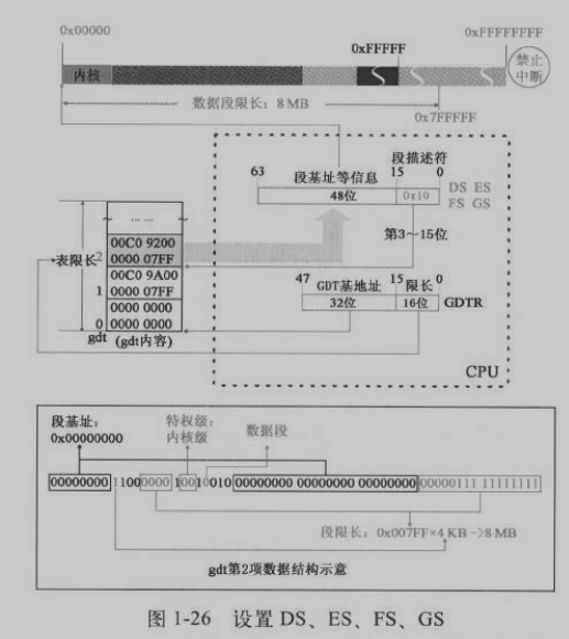 ds,es,fs,gs设置为0x10 。 0x10:b(10000)特权级是0,全局描述符表,第10也就是第三项,即内核数据段。